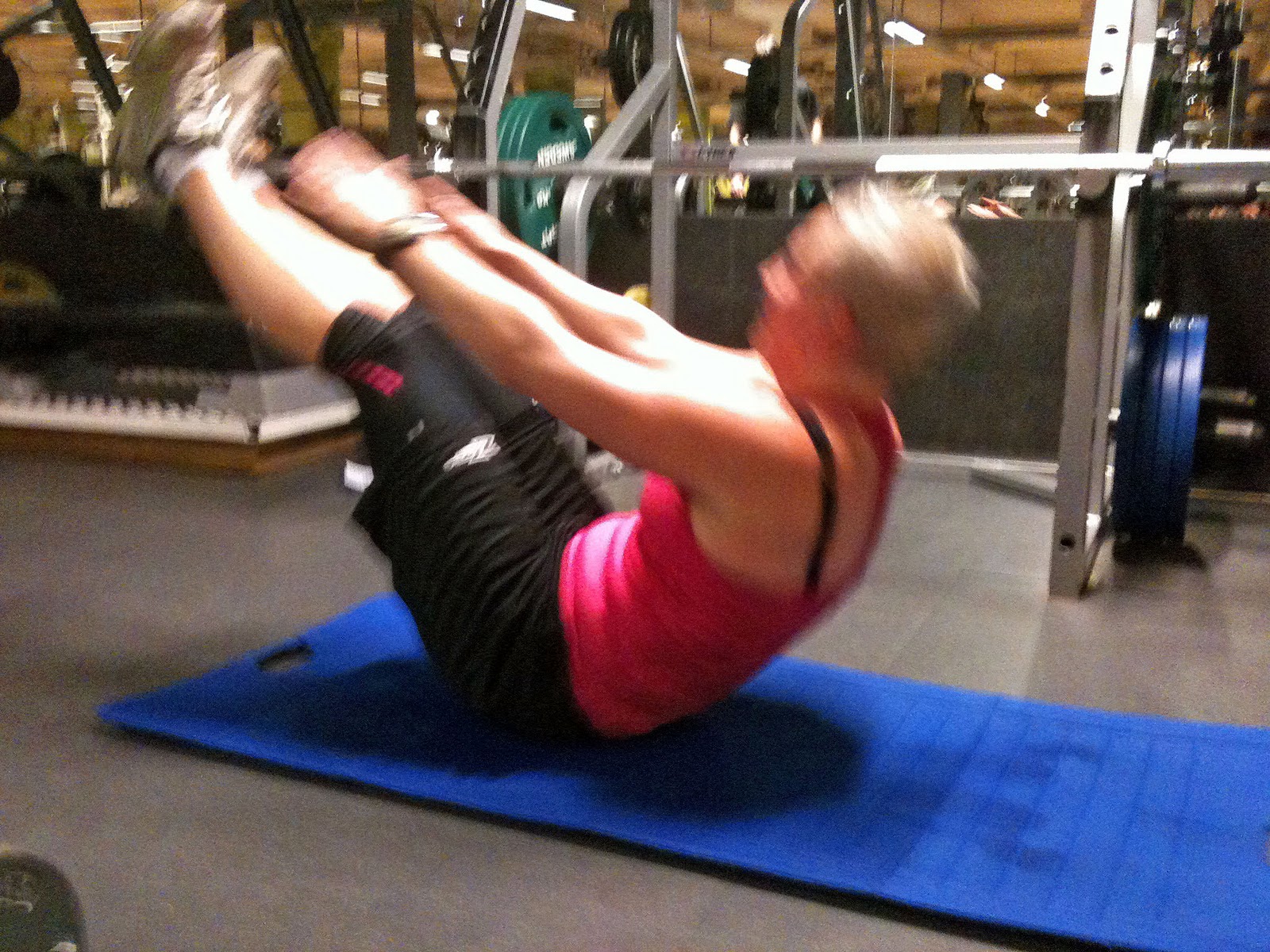 * Fällkniven – Ligg rak lång på rygg och sedan ska benen vara rakt upp och armarna rakt upp. Så det blir som en sit-up fast med benen.